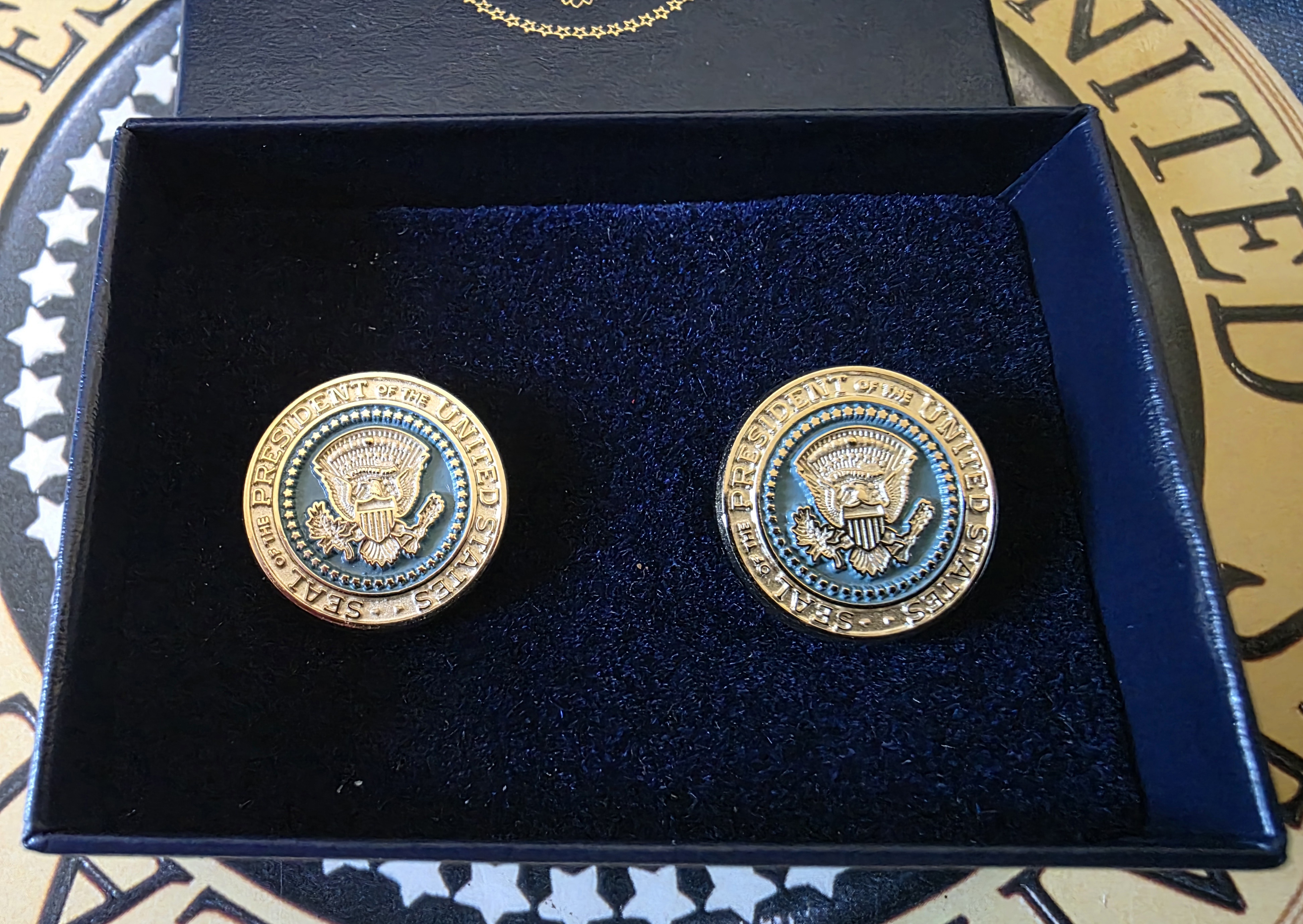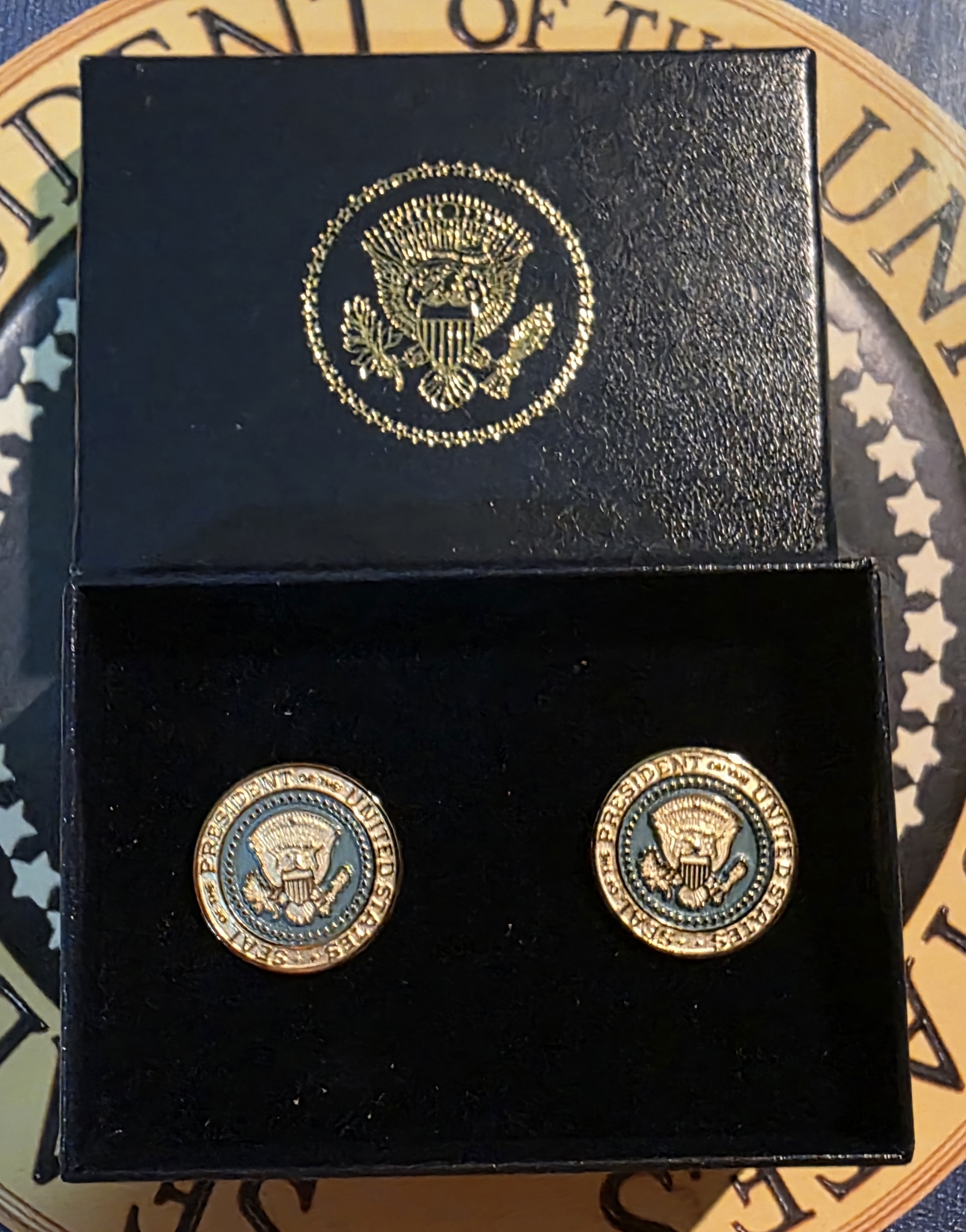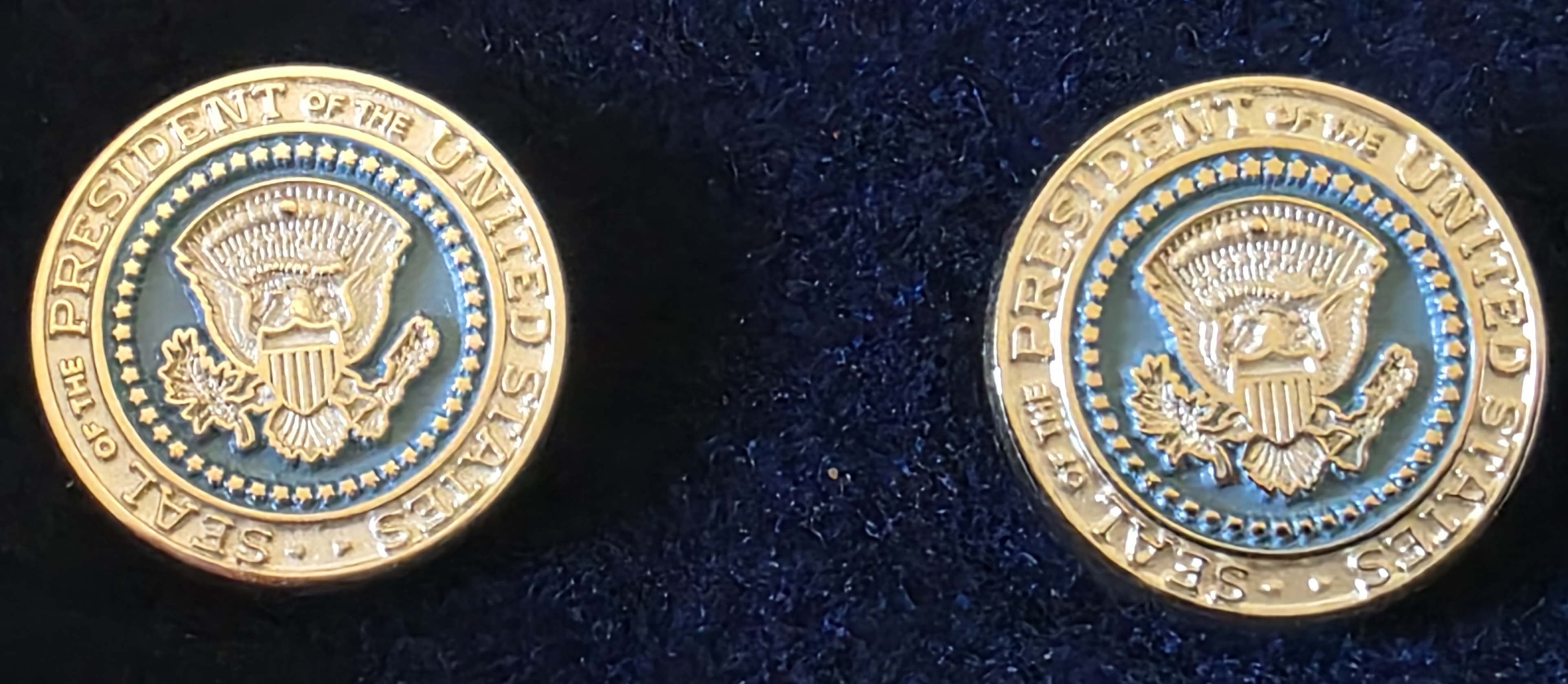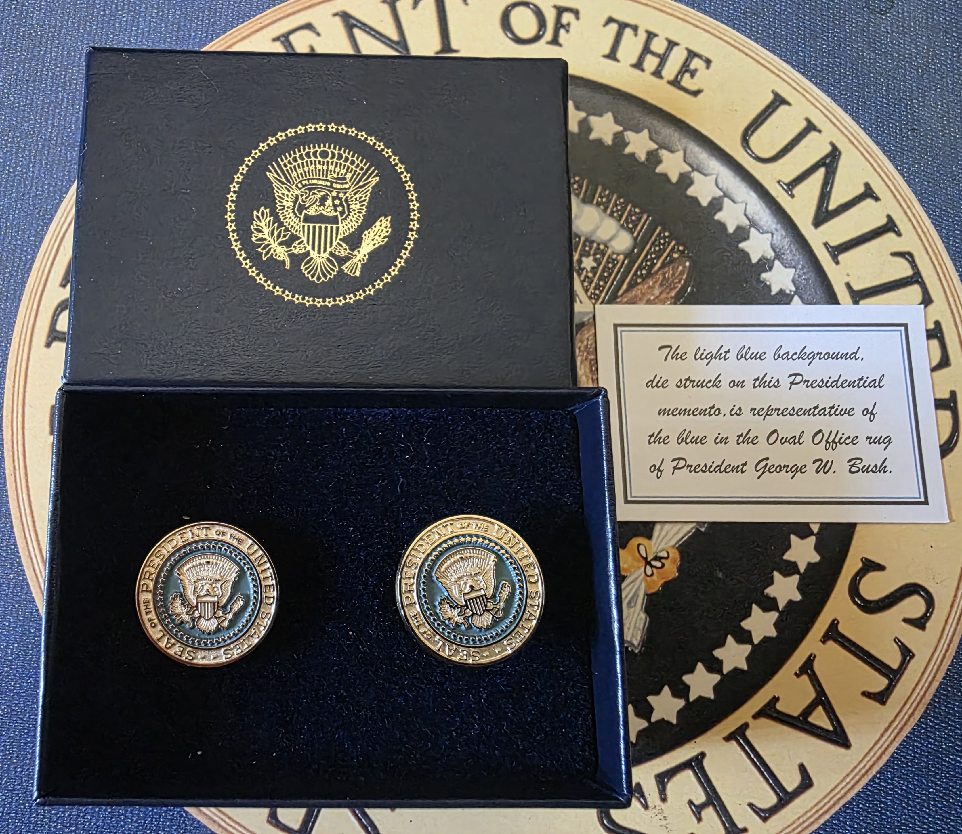 This is a beautiful set of George W. Bush di struck Presidential Seal Cufflinks from his first term. These were among the first official Presidential gifts given out by President Bush.