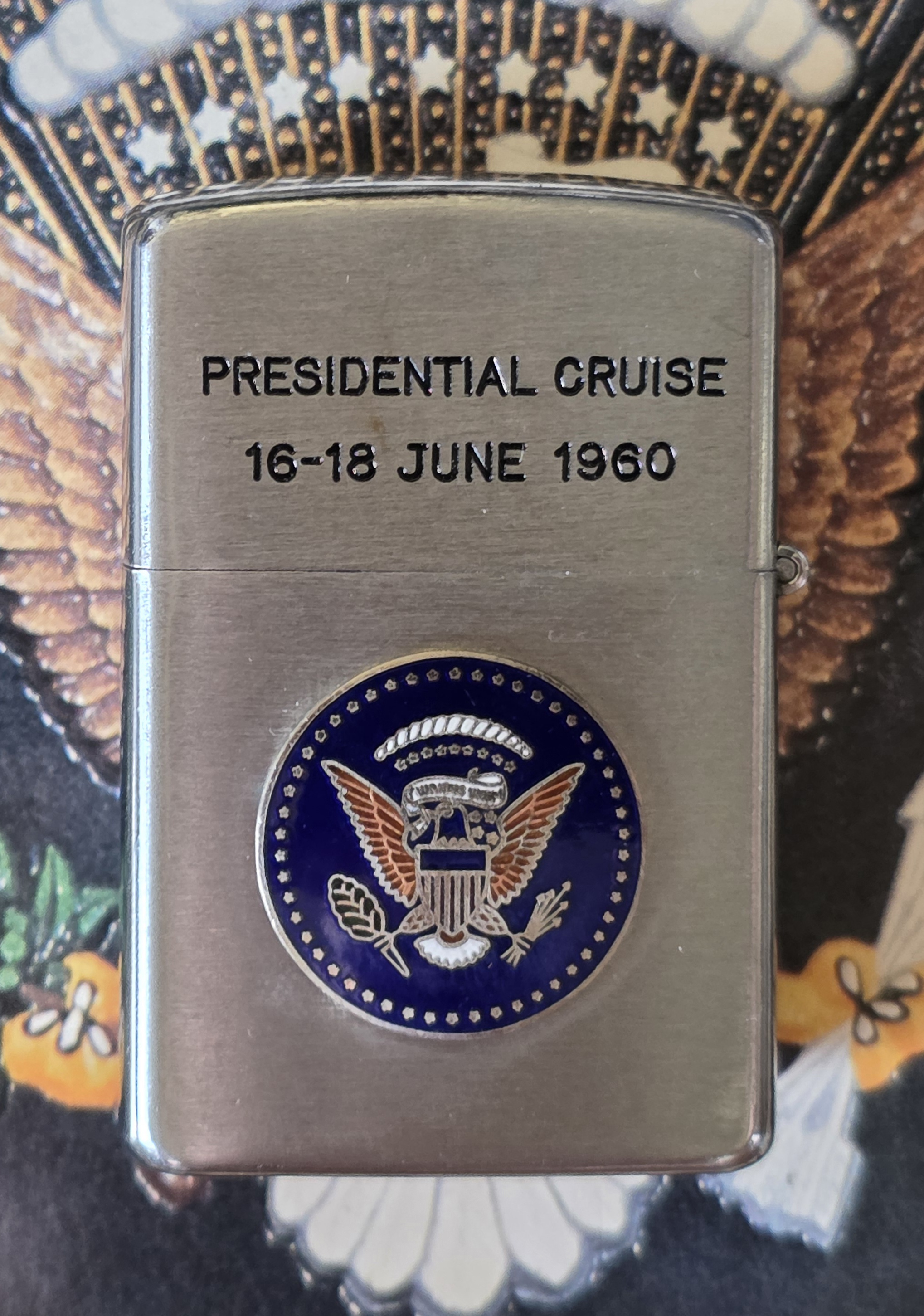 This is a rare VIP gift from President Eisenhower Presidential Cruise June 16th -18th June 1960 on board the U.S.S. Saint Paul. This cruise was for heads of state and important diplomats as part of his Pacific Rim Tour. It left from the Philippians where President Eisenhower received the Order of Sikatuna, Raja rank, the highest Philippine decoration, conferred only on heads of state.