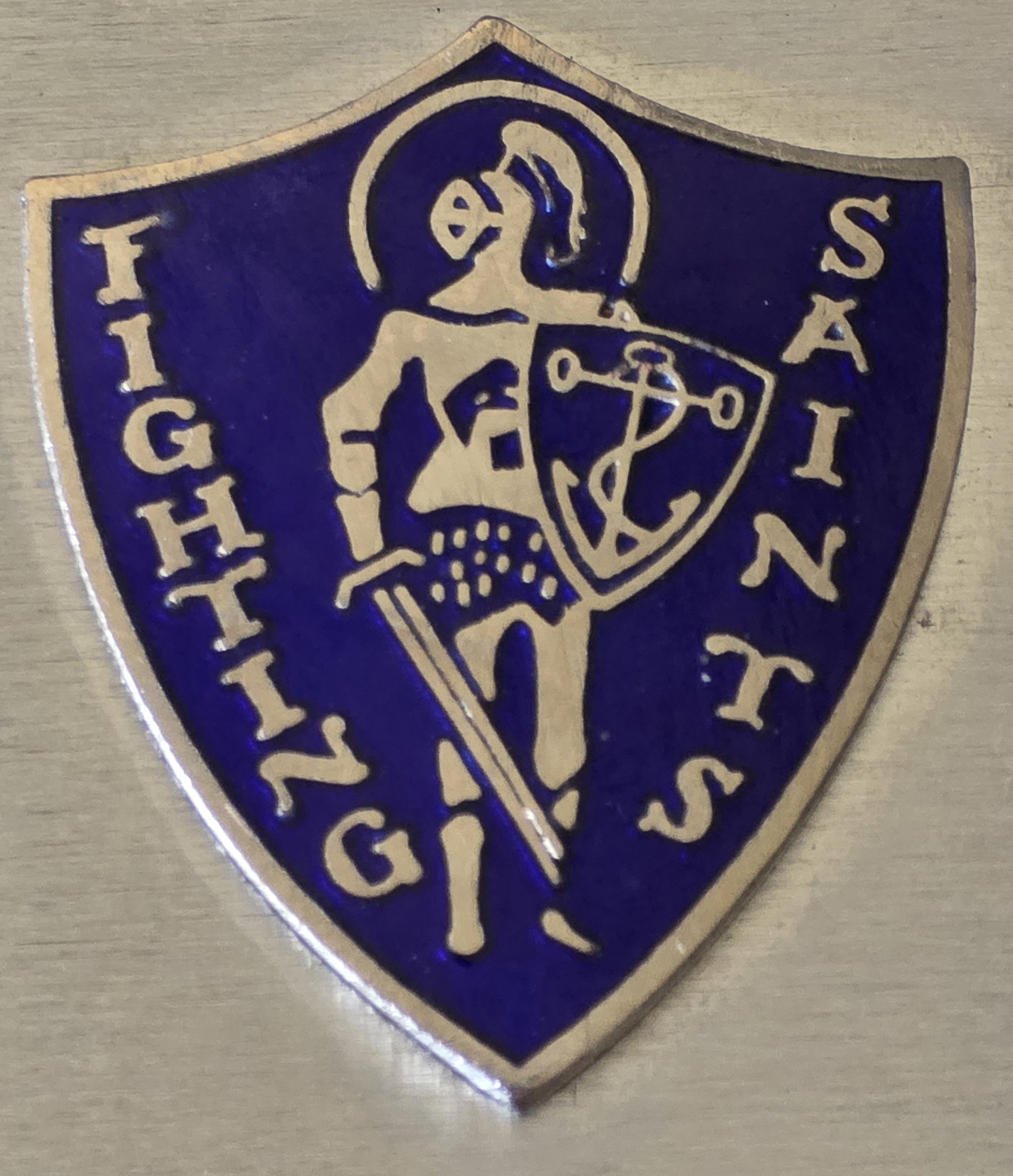With a raised enameled shield, on which it reads "Fighting Saints" with a figure of a weapons clad figure.