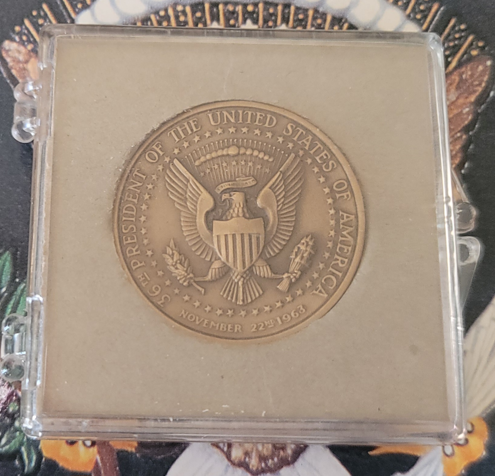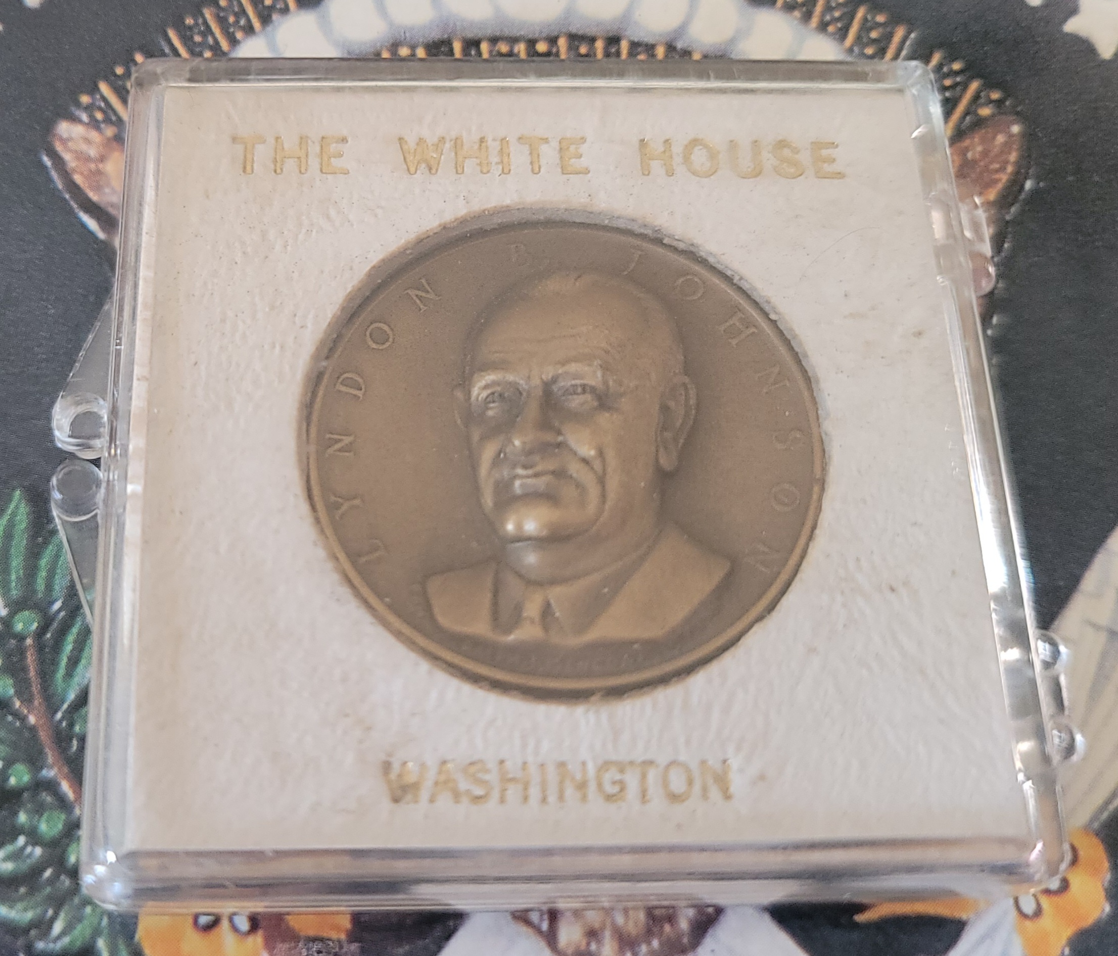 This is a beautiful Medal incased in Lucite to make a Presidential paperweight. This was an official President Johnson White House gift. What makes this particular gift so special is it is still wrapped in its original holiday gift wrap that The Johnson White House used for some of President Johnson official Presidential holiday gifts. The first row of photos show the Lucite encase medal paperweight that you will receive still wrapped up for the holidays. The second line shows one of these gifts opened so you can see what's inside. The opened one is from, the same estate to give you a real idea of the item inside and its condition. $55.00