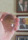 This is a beutiful gift from The Osama administration. I t is a lovely glass paperweight feature the Presidential Seal and a facsimile of President Osama's signature. It is approximately 3"by 4"and very heavy about 11 ounces. $50.00