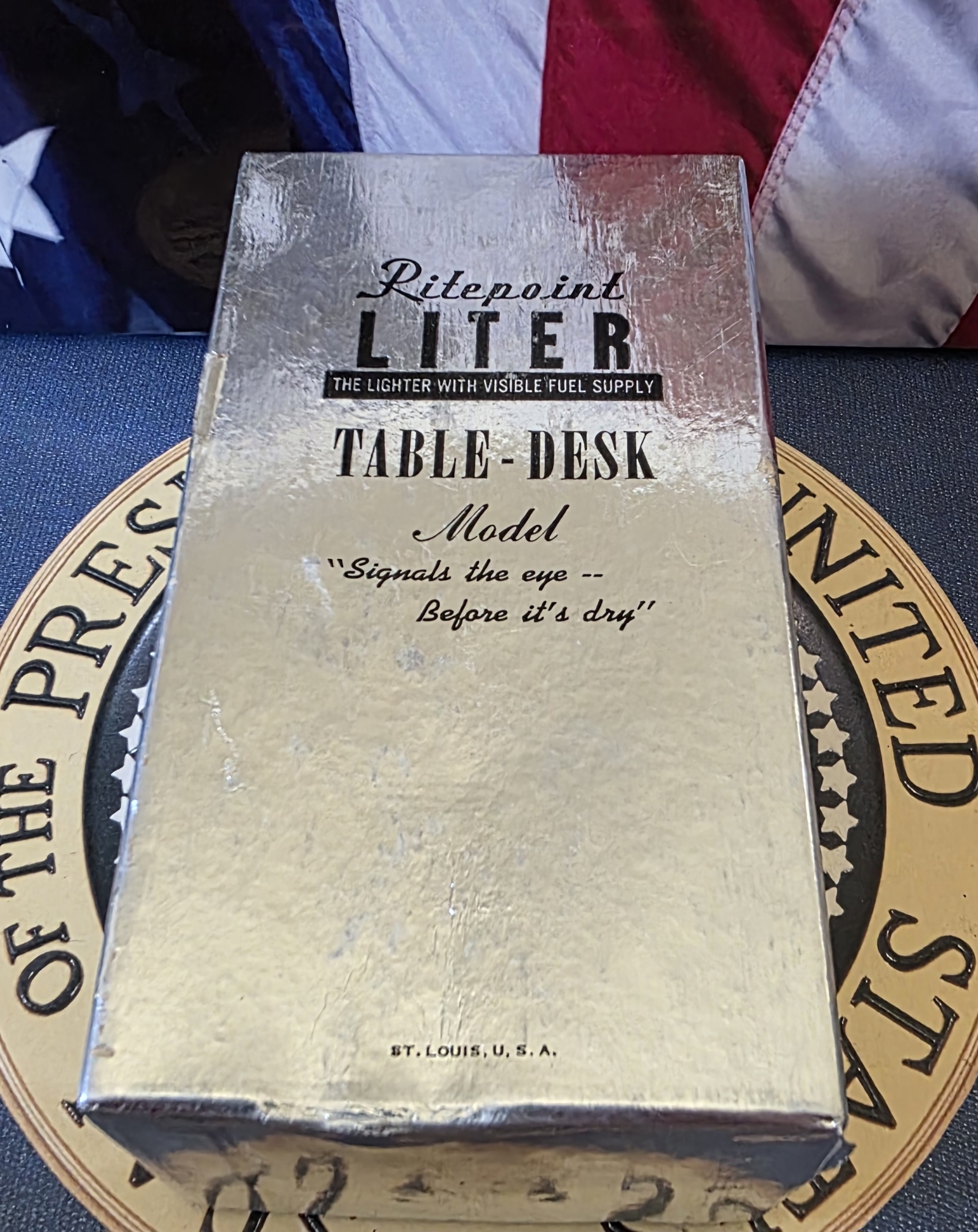 This is a beautiful official White House Table lighters from The Truman White House. From the research I have done these Truman table lighters were used both in The Truman White House and as official Presidential gifts. These would make the perfect gift for any Truman or Presidential collector. The lighter is in fantastic and what looks to me to be in unused condition. What makes this item even more rare is that it still comes in it's original box including paperwork. The box shows some natural ware please see photos. This truly a museum quality find.