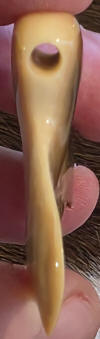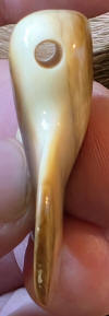 This is a nice vintage hand carved pendant shaped like a whale’s tail from Hawaii in the eighties. Penny shown for size only.
