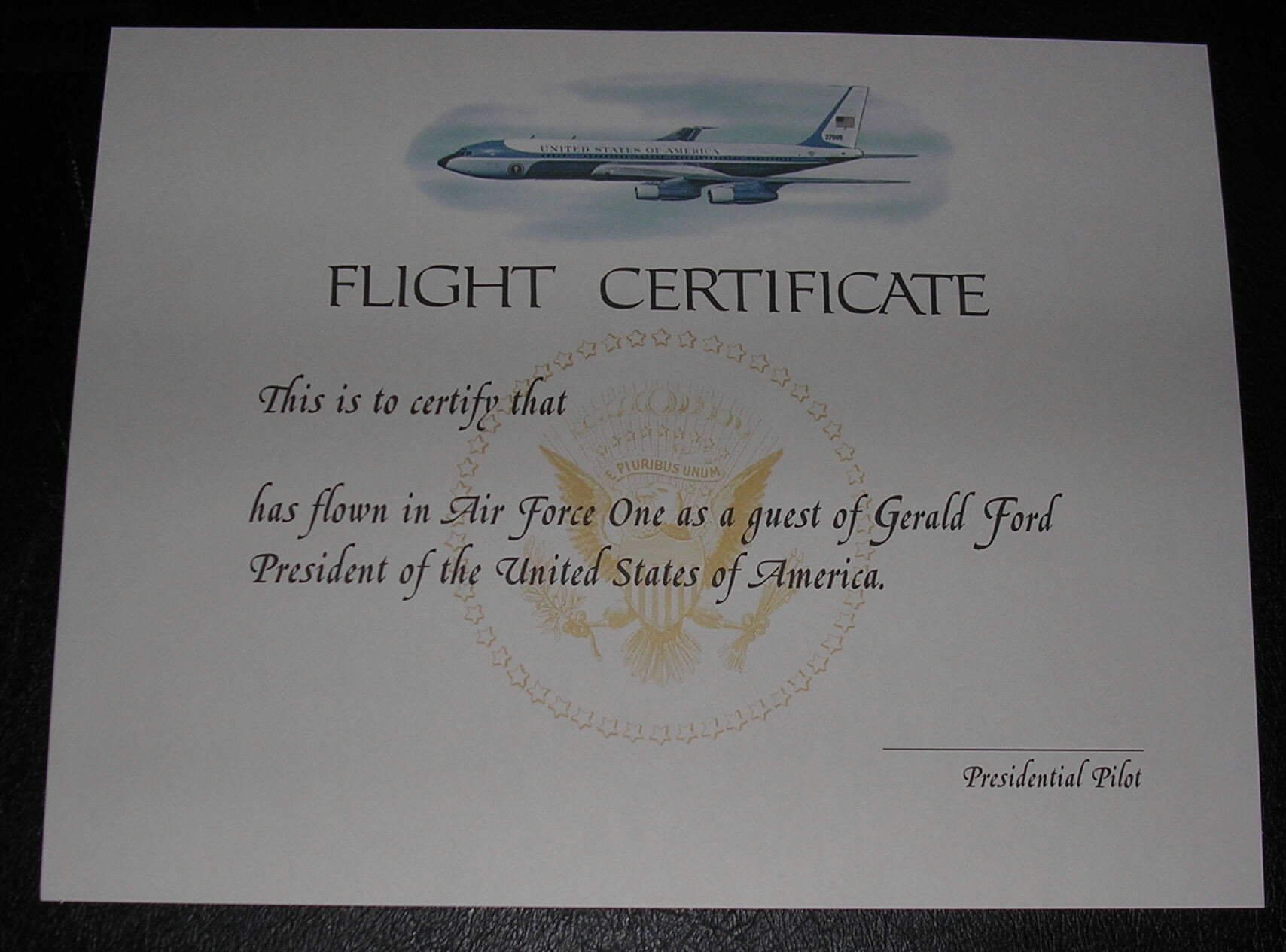 Unfilled out President Ford Air Force One Fight Certificate in good condition. $75.00