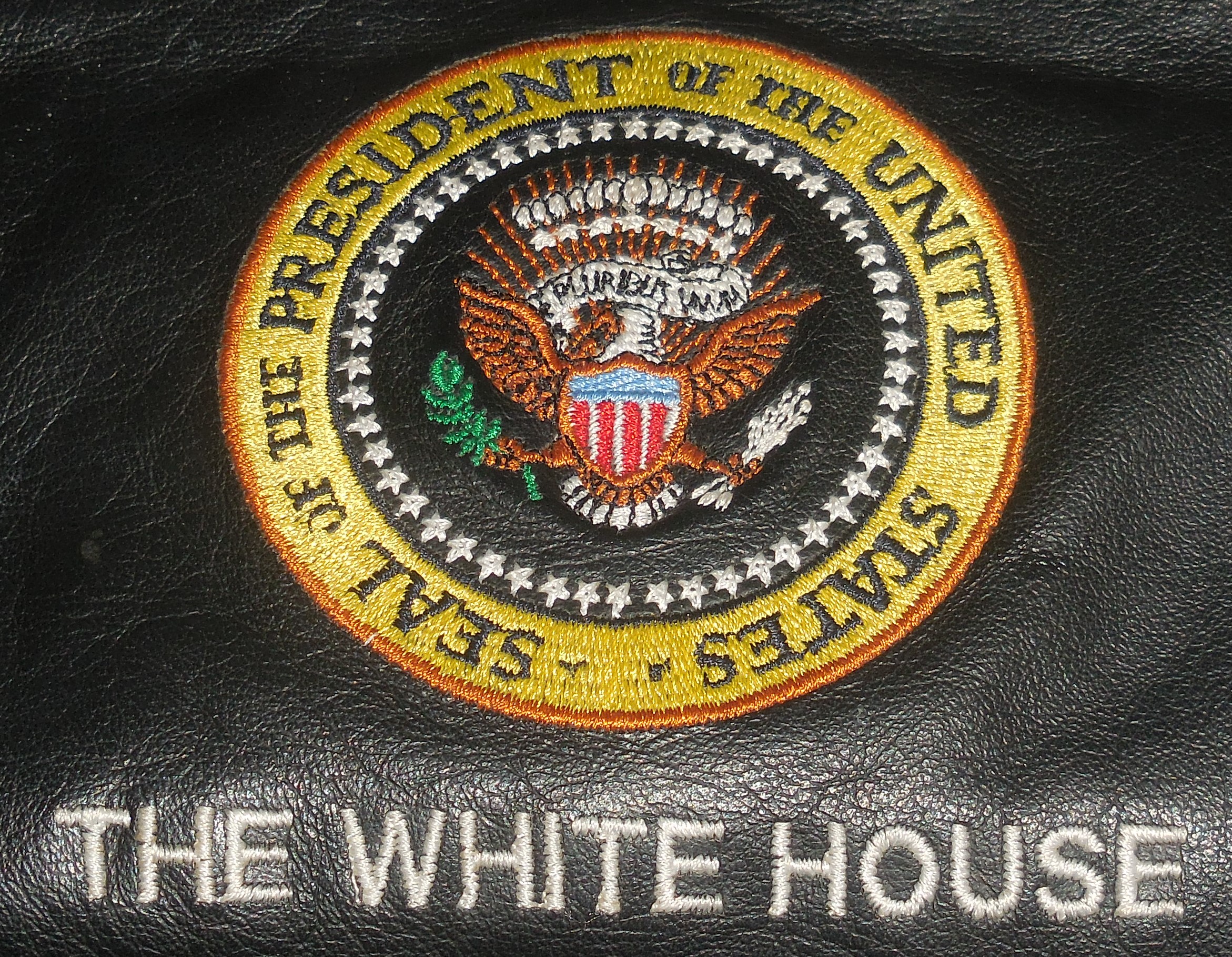 Very Nice White House Black Leather Toiletry Bag or Accessory Bag. This leather Bag in embroidered with a full color Presidential Seal and the words “The White House” $150.00