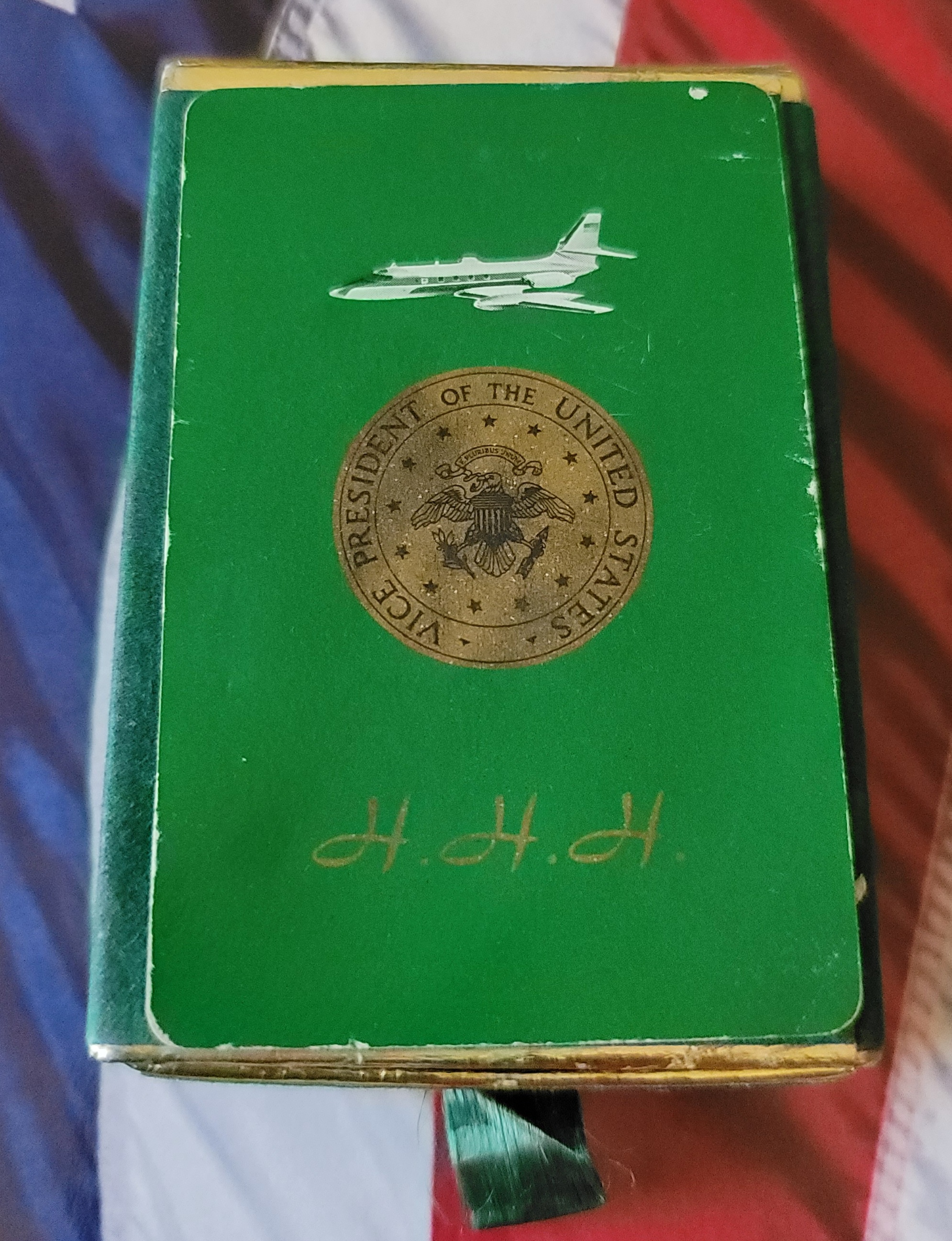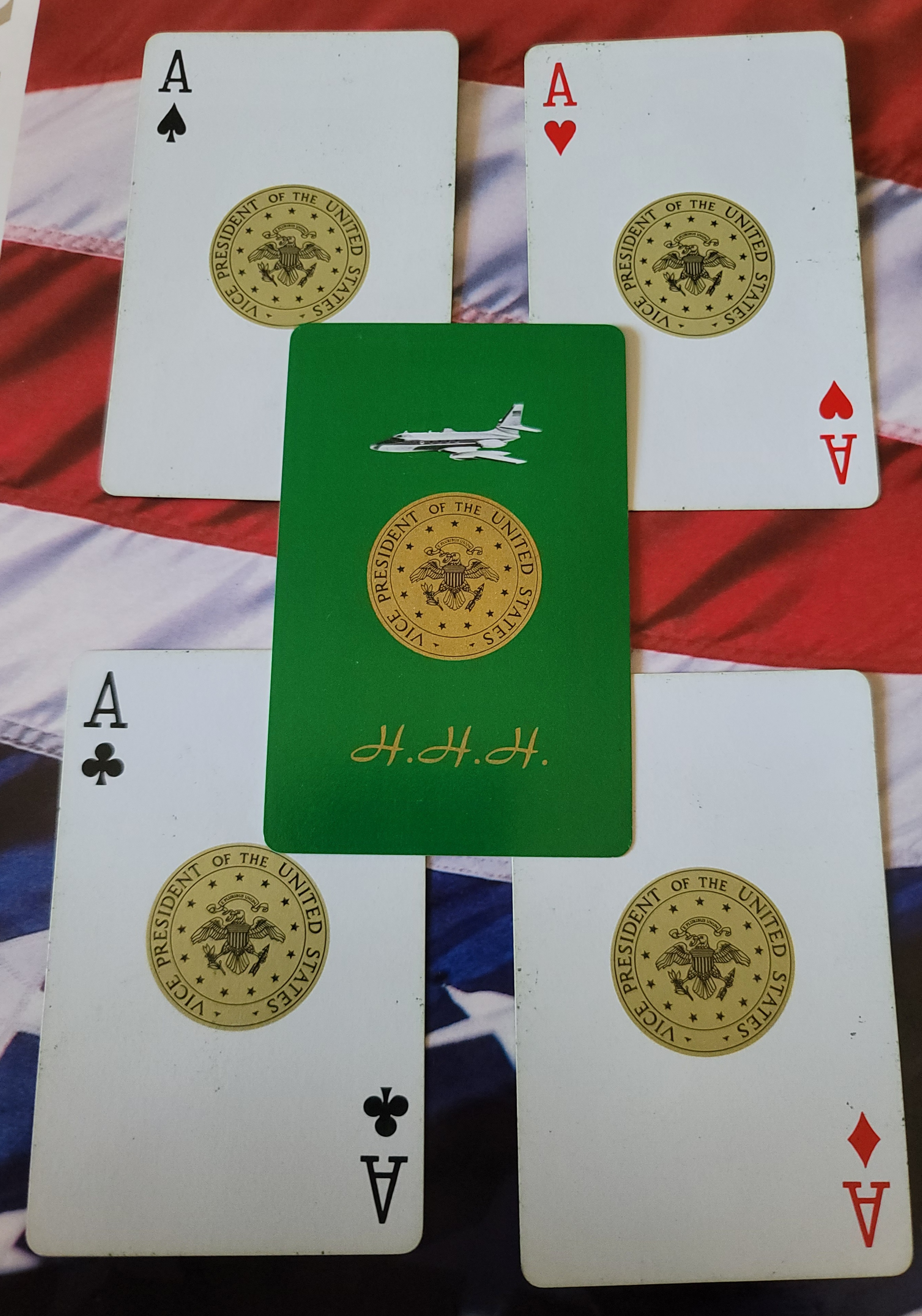 This is a complete vintage set of Vice President Hubert H. Humphrey “HHH” playing cards from off of Air Force Two. This is a used but complete set of cards. This is a nice souvenir from the LBJ administration. $70.00