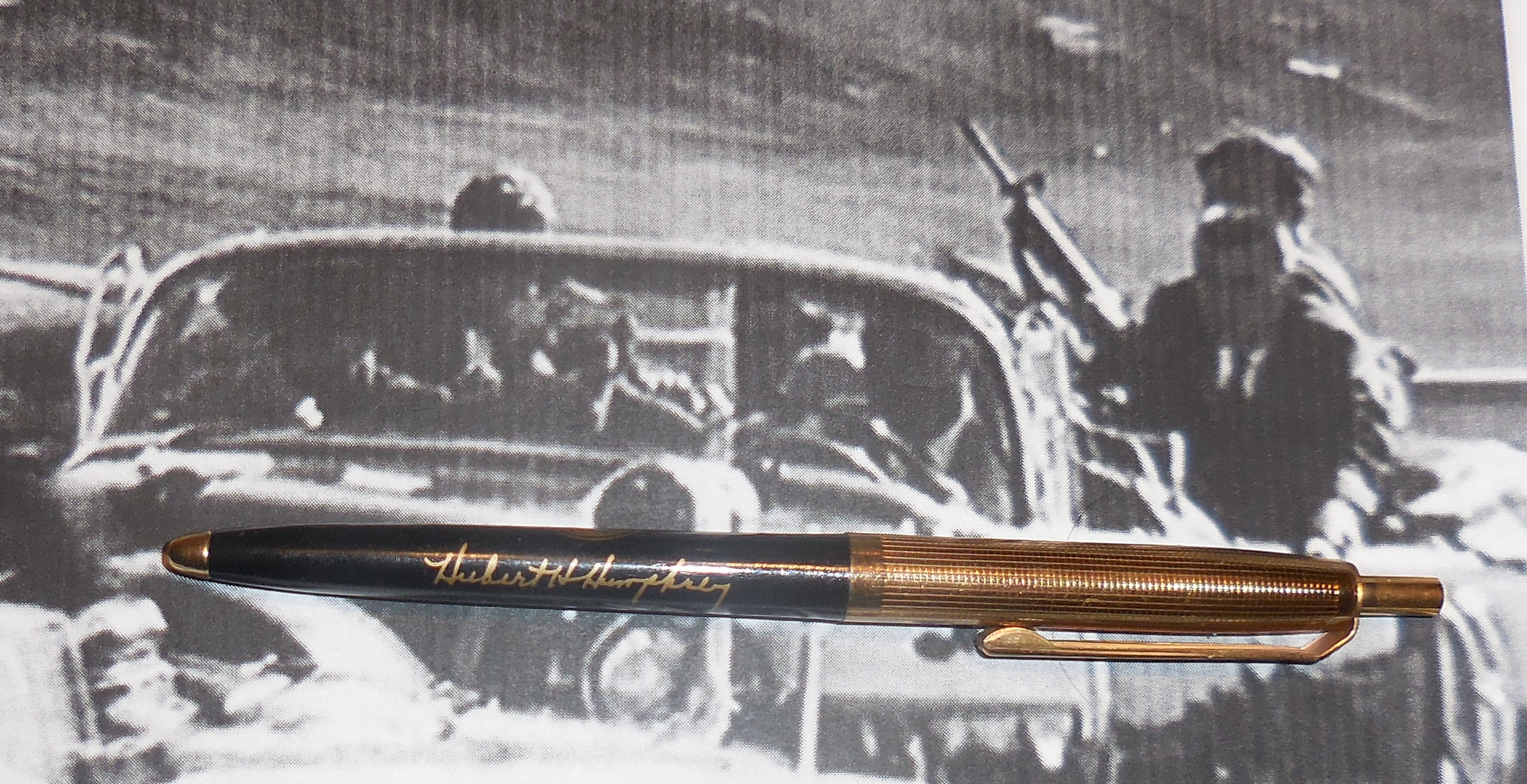 This is an actual Humphrey Vice Presidential gift pen from the estate of Special Agent George W. Hickey. The Vice Presidential gift pen looks good but no longer works. Special Agent George W. Hickey was a Secret Service Agent assigned for executive protection for The Kennedy White House and he was assigned to the lead follow up car on the fateful Dallas motorcade on 22 Nov 1963. The Warren Commission reported: "Special Agent George W. Hickey, Jr., in the rear seat of the Presidential follow-up car, picked up and cocked an automatic rifle as he heard the last shot. At this point the cars were speeding through the underpass and had; left the scene of the shooting, but Hickey kept the automatic weapon ready as the car raced to the hospital. Most of the other Secret Service agents in the motorcade had drawn their sidearms. What has unfortunately made George Hickey famous and what will forever tie him to the end of Camelot is that he was accused of being the person responsible for the Death of President Kennedy by Bonar Menninger in both a book called Mortal error and later a documentary titled JFK The Smoking Gun. He claimed that after the first shot, Hickey stood up and lost his balance, and accidentally discharging his gun into the back of Kennedy’s head. The photos of the Hickey are just for reference and are not included however I am including a copy of Special Agent George Hickey's Executive Office building ID Tag as well as his Association of Retired Secret Service Agents ID Card. $25.00
