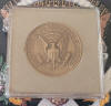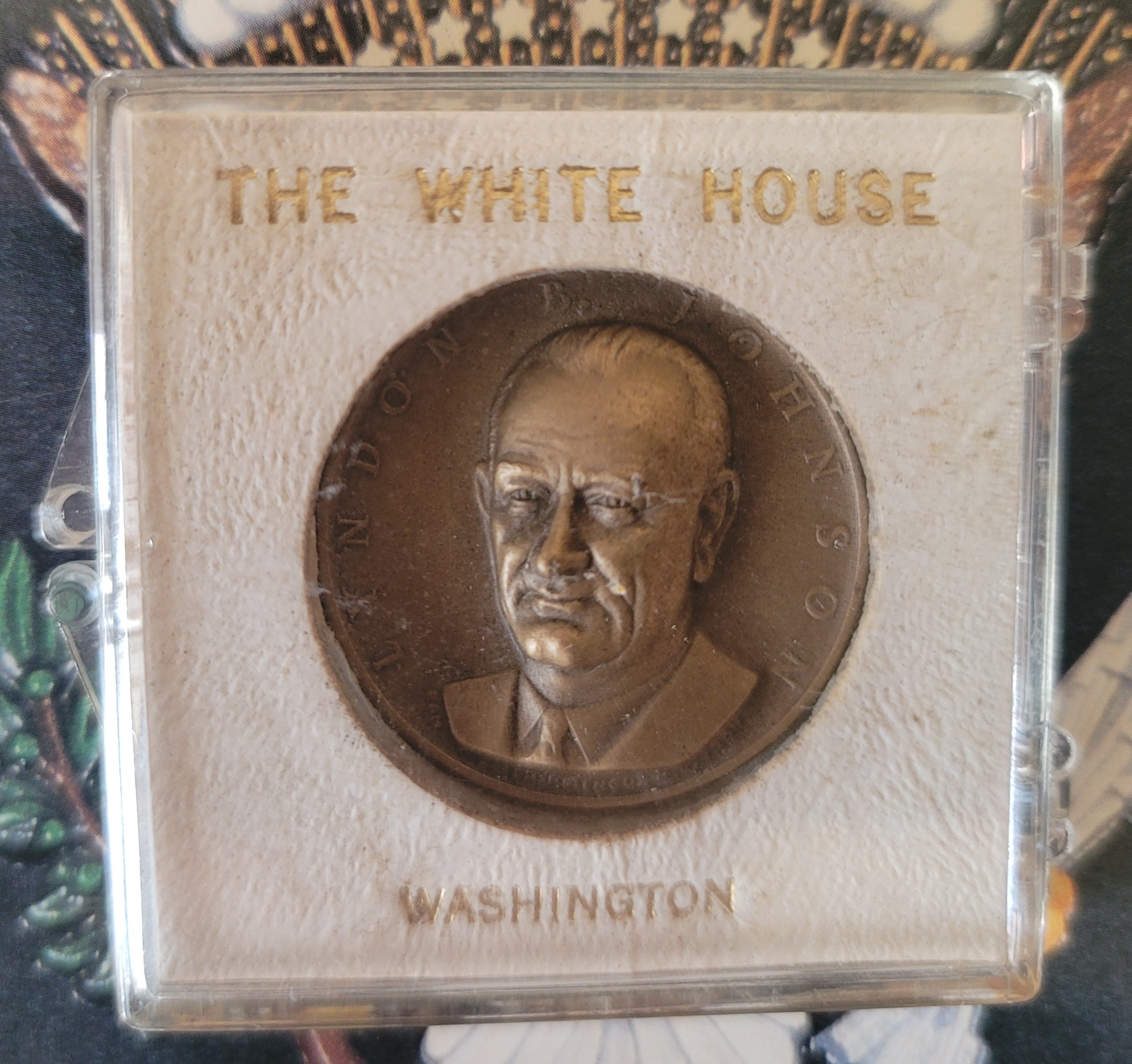 This is a beautiful Medal incased in Lucite to make a Presidential paperweight. This was an official President Johnson White House gift. What makes this particular gift so special is it is still wrapped in its original holiday gift wrap that The Johnson White House used for some of President Johnson official Presidential holiday gifts. The first row of photos show the Lucite encase medal paperweight that you will receive still wrapped up for the holidays. The second line shows one of these gifts opened so you can see what's inside. The opened one is from, the same estate to give you a real idea of the item inside and its condition. $55.00