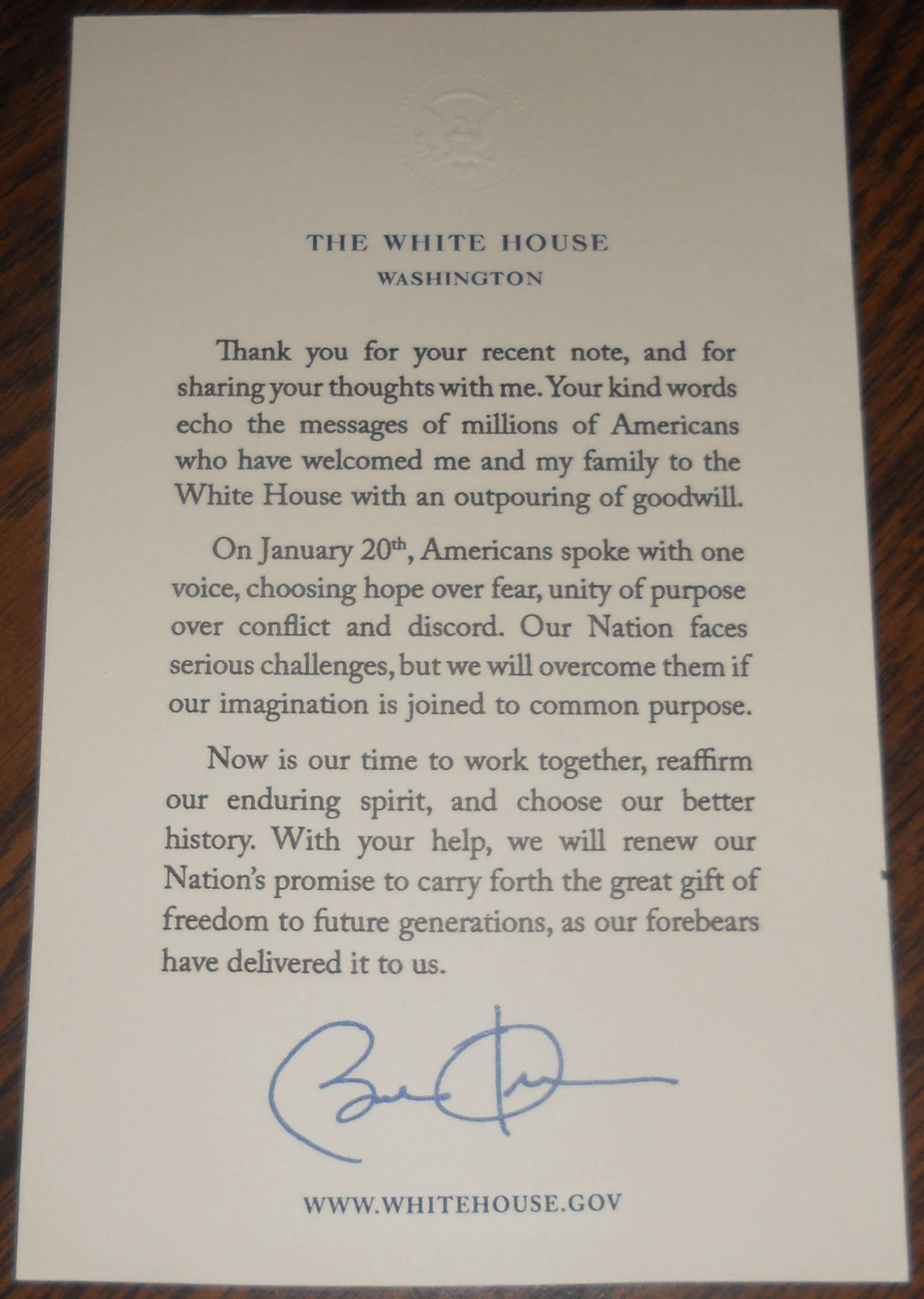 BARACK OBAMA first issued WHITE HOUSE THANK YOU CARD